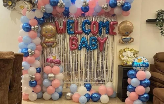 Welcome your bundle of joy with a charming setup full of pastel balloons, baby-themed props, and adorable personalized touches that make guests smile and parents proud.